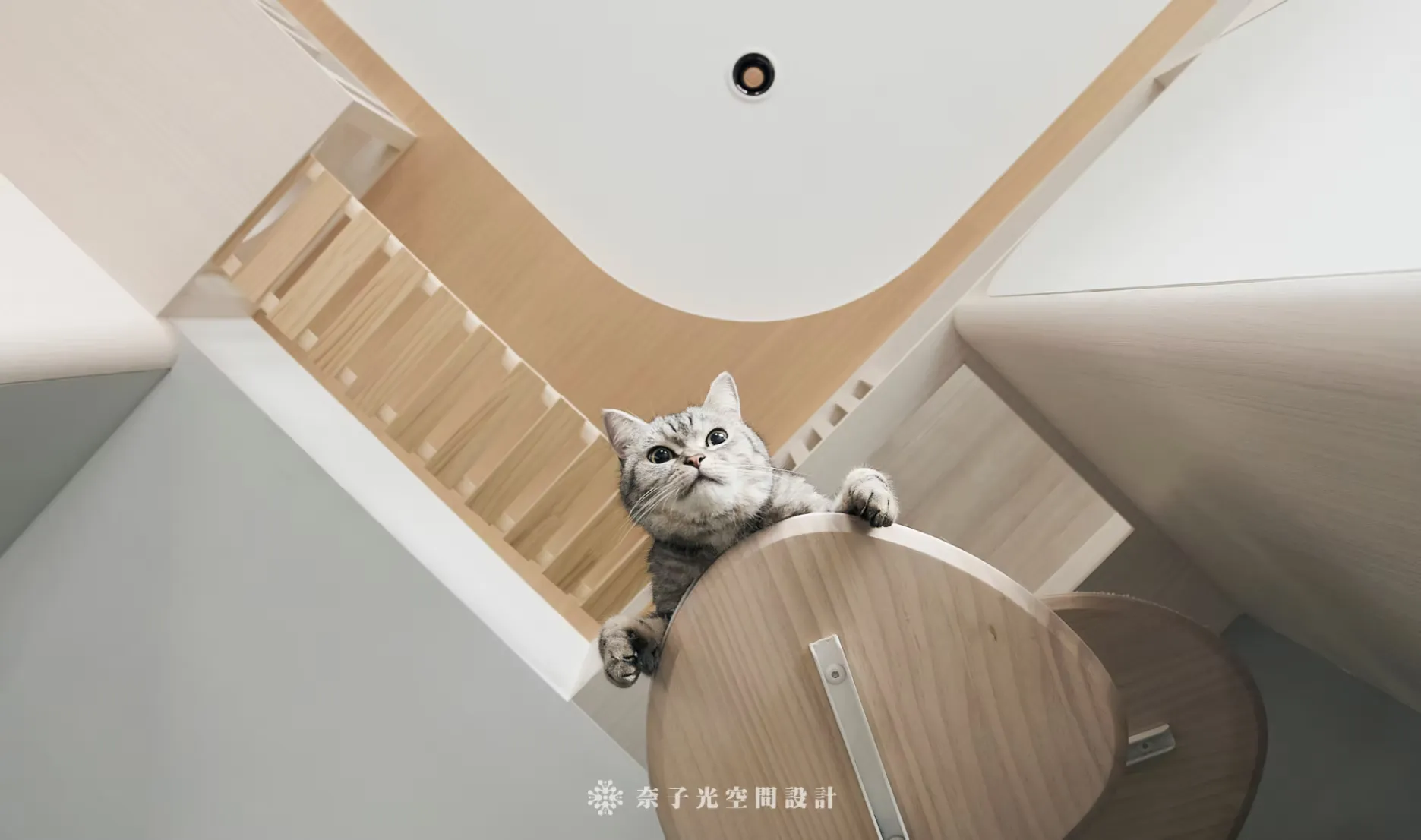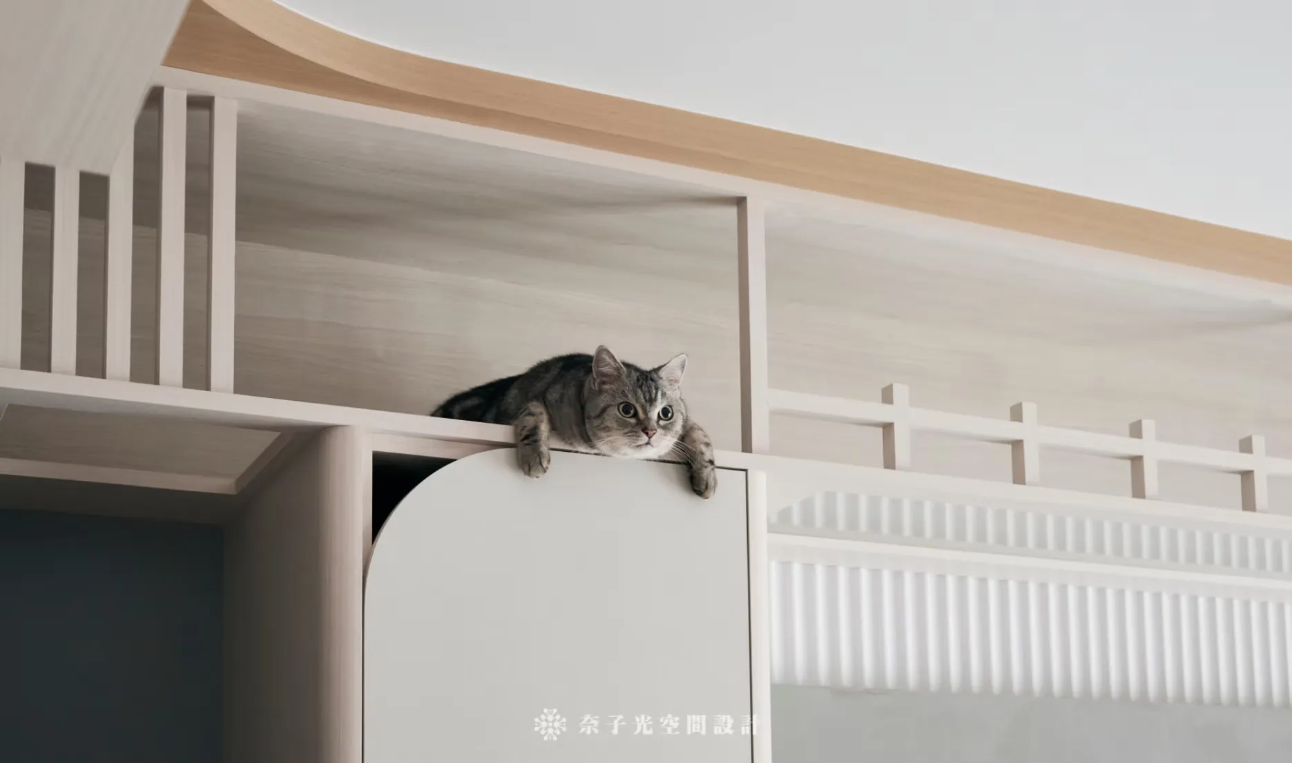 在這個空間中,人與貓的需求不再是分離的兩個系統,而是交織在一起,共同構建出適合雙方生活的環境。 設計上不僅滿足人類的日常需求,還考量貓咪的習性與探索天性,思考垂直動態路徑、隱蔽空間等設計元素,讓貓咪與人類在同一個空間裡,既能互動也能各自擁有專屬的放鬆角落,並且透過自然、柔和的設計元素,創造出彼此互動、溫馨共處的家。